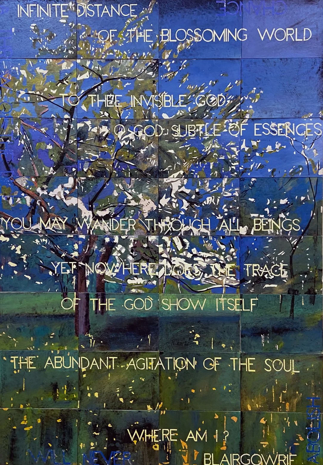 “The landscape in In these latitudes appropriates, or quotes, John Glover’s Moulting Lagoon and Great Oyster Bay, from Pine Hill, c.1838. The colonial landscape is overlaid with Tasmanian place names loosely positioned according to their location, and interspersed with phrases from Stephane Mallarme’s poem Throw of the Dice, the source of the title. The cut up text is sourced from the works of Australian artist Rosalie Gascoigne who, like Imants Tillers, lived in the Monaro region in New South Wales.”